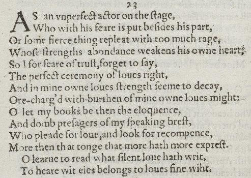 In Shakespeare’s Sonnet 23, the speaker expresses his fear of conveying his love to the person that this sonnet is addressed to. Throughout the sonnet, the speaker repeats his feelings of fear and how his strong love for the individual addressed affects his inability to express his feelings for them. There are also various forms of poetic language including alliteration, enjambment, and simile which are very important in expressing the speaker's emotions and state of mind. The sonnet starts off with the speaker comparing himself to an “unperfect actor” who is incapable of playing his part mainly because of fear and a wild creature that is “replete with too much rage.” The speaker then continues to say that he is unable to express his emotion and produce a proper confession of love because of the mixture of love and fear that is building up inside of him. Finally, at the end of the sonnet, the speaker says that his only way of truly expressing his feelings of love is through writing because he is terrified of his speech failing him.